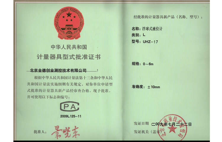 浮球計(jì)量器具形式批準(zhǔn)證書(shū)