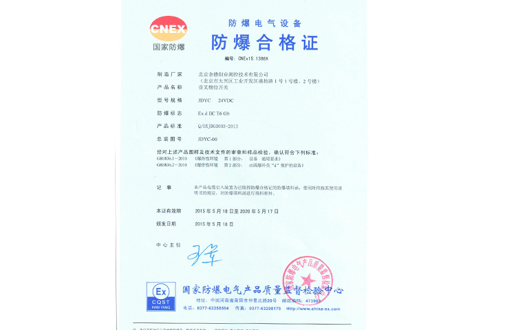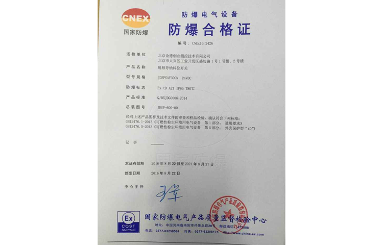 射頻導(dǎo)納開(kāi)關(guān)防粉塵防爆合格證