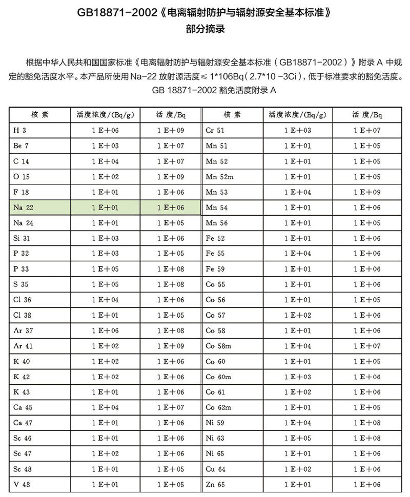 ◎ 放射源 Na-22 輻射活性低,對人體無害。